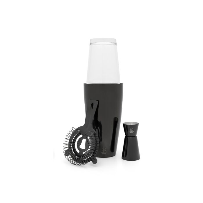 Shake like a pro met deze Boston shaker-set, bestaande uit een shaker, strainer en jigger. Met deze mooie set in het zwart steel jij de show! De shaker heeft een inhoud van 450 ml.